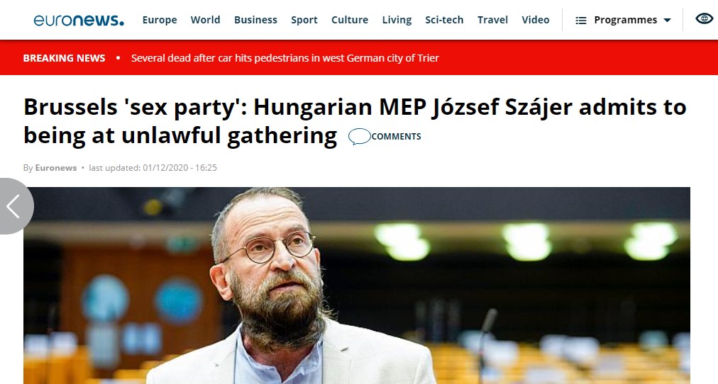 Ο Ούγγρος ευρωβουλευτής, József Szájer, ήταν αυτός που συμμετείχε στο πάρτι με σεξ και ναρκωτικά εν μέσω κορονοϊού στις Βρυξέλλες. Ομολόγησε ο ίδιος σε δήλωσή που φιλοξενείται στα ΜΜΕ της πατρίδας του, ενώ ταυτόχρονα και το κόμμα του, το Fidesz, το επιβεβαίωσε στο Euronews.