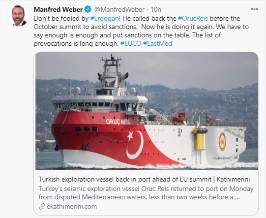«Μην ξεγελιέστε από τον Ερντογάν! Απέσυρε το Oruc Reis πριν από τη Σύνοδο Κορυφής του Οκτωβρίου για να αποφύγει τις κυρώσεις. Τώρα το κάνει ξανά» αναφέρει σε μήνυμά του στο Twitter ενόψει του Ευρωπαϊκού Συμβουλίου της ερχόμενης εβδομάδας, ο επικεφαλής της Κοινοβουλευτικής Ομάδας του Ευρωπαϊκού Λαϊκού Κόμματος, Μάνφρεντ Βέμπερ.