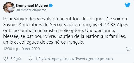 «Για να σώσουν ζωές, αναλαμβάνουν όλους τους κινδύνους. Σήμερα το απόγευμα στο Σαβουά, 3 μέλη της Γαλλικής Αεροπορικής Διάσωσης και 2 διασώστες από το CRS Alpes έχασαν τη ζωή τους σε συντριβή ελικοπτέρου. Ένας τραυματίας αγωνίζεται για τη ζωή του. Υποστήριξη από το Έθνος στις οικογένειες, τους φίλους και τους συναδέλφους αυτών των Γάλλων ηρώων», το μήνυμα του Γάλλου Προέδρου στο Twitter.