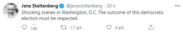 Διεθνείς αντιδράσεις προκαλούν τα όσα διαδραματίζονται τις τελευταίες ώρες στην Ουάσινγκτον. Ο Γενικός Γραμματέας του ΝΑΤΟ, Γενς Στόλτενμπεργκ σε ανάρτησή του στο twitter, κάνει λόγο για “σοκαριστικές σκηνές” και κάλεσε να γίνει σεβαστό το αποτέλεσμα των εκλογών.