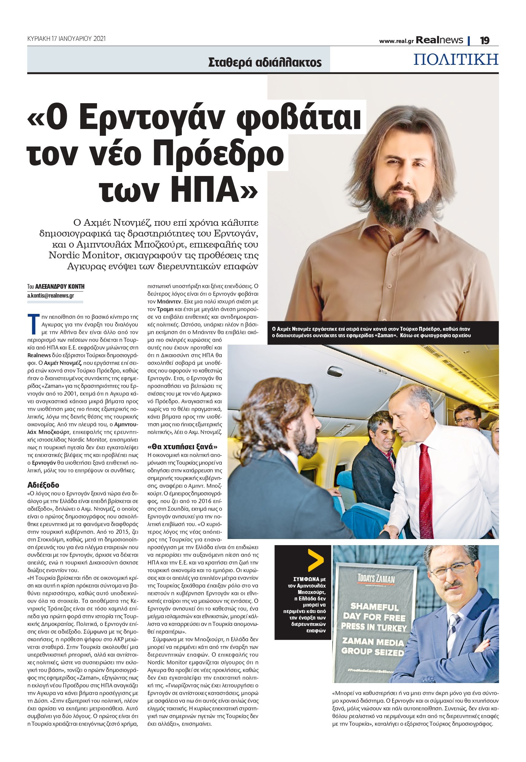 «Ο λόγος που ο Ερντογάν ξεκινά τώρα ένα διάλογο με την Ελλάδα είναι επειδή βρίσκεται σε αδιέξοδο», δηλώνει ο Αχμ. Ντονμέζ, ο οποίος είναι ο πρώτος δημοσιογράφος που ασχολήθηκε ερευνητικά με τα φαινόμενα διαφθοράς στην τουρκική κυβέρνηση. Από το 2015, ζει στη Στοκχόλμη, καθώς, μετά τη δημοσιοποίηση έρευνάς του για ένα πλέγμα εταιρειών που συνδέεται με τον Ερντογάν, άρχισε να δέχεται απειλές, ενώ η τουρκική Δικαιοσύνη άσκησε διώξεις εναντίον του. «Η Τουρκία βρίσκεται ήδη σε οικονομική κρίση και αυτή η κρίση πρόκειται σύντομα να βαθύνει περισσότερο, καθώς αυτό υποδεικνύουν όλα τα στοιχεία. Τα αποθέματα της Κεντρικής Τράπεζας είναι σε τόσο χαμηλά επίπεδα για πρώτη φορά στην ιστορία της Τουρκικής Δημοκρατίας. Πολιτικά, ο Ερντογάν επίσης είναι σε αδιέξοδο. Σύμφωνα με τις δημοσκοπήσεις, η πρόθεση ψήφου στο ΑΚΡ μειώνεται σταθερά. Στην Τουρκία ακολουθεί μια υπερεθνικιστική ρητορική, αλλά και αντίστοιχες πολιτικές, ώστε να συσπειρώσει την εκλογική του βάση», τονίζει ο πρώην δημοσιογράφος της εφημερίδας «Ζaman», εξηγώντας πως η εκλογή νέου Προέδρου στις ΗΠΑ αναγκάζει την Αγκυρα να κάνει βήματα προσέγγισης με τη Δύση. «Στην εξωτερική του πολιτική, πλέον έχει αρχίσει να εκπέμπει μετριοπάθεια. Αυτό συμβαίνει για δύο λόγους. Ο πρώτος είναι ότι η Τουρκία χρειάζεται επειγόντως ζεστό χρήμα, Ο Αχμέτ Ντονμέζ, που επί χρόνια κάλυπτε δημοσιογραφικά τις δραστηριότητες του Ερντογάν, και ο Αμπντουλάχ Μποζκούρτ, επικεφαλής του Nordic Monitor, σκιαγραφούν τις προθέσεις της Αγκυρας ενόψει των διερευνητικών επαφών πιστωτική υποστήριξη και ξένες επενδύσεις. Ο δεύτερος λόγος είναι ότι ο Ερντογάν φοβάται τον Μπάιντεν. Είχε μια πολύ ισχυρή σχέση με τον Τραμπ και έτσι με μεγάλη άνεση μπορούσε να επιβάλει επιθετικές και αντιδημοκρατικές πολιτικές. Ωστόσο, υπάρχει πλέον η βάσιμη εκτίμηση ότι ο Μπάιντεν θα επιβάλει ακόμα πιο σκληρές κυρώσεις από αυτές που έχουν προταθεί και ότι η Δικαιοσύνη στις ΗΠΑ θα ασχοληθεί σοβαρά με υποθέσεις που αφορούν το καθεστώς Ερντογάν. Ετσι, ο Ερντογάν θα προσπαθήσει να βελτιώσει τις σχέσεις του με τον νέο Αμερικανό Πρόεδρο. Αναγκαστικά και χωρίς να το θέλει πραγματικά, κάνει βήματα προς την υιοθέτηση μιας πιο ήπιας εξωτερικής πολιτικής», λέει ο Αχμ. Ντονμέζ.