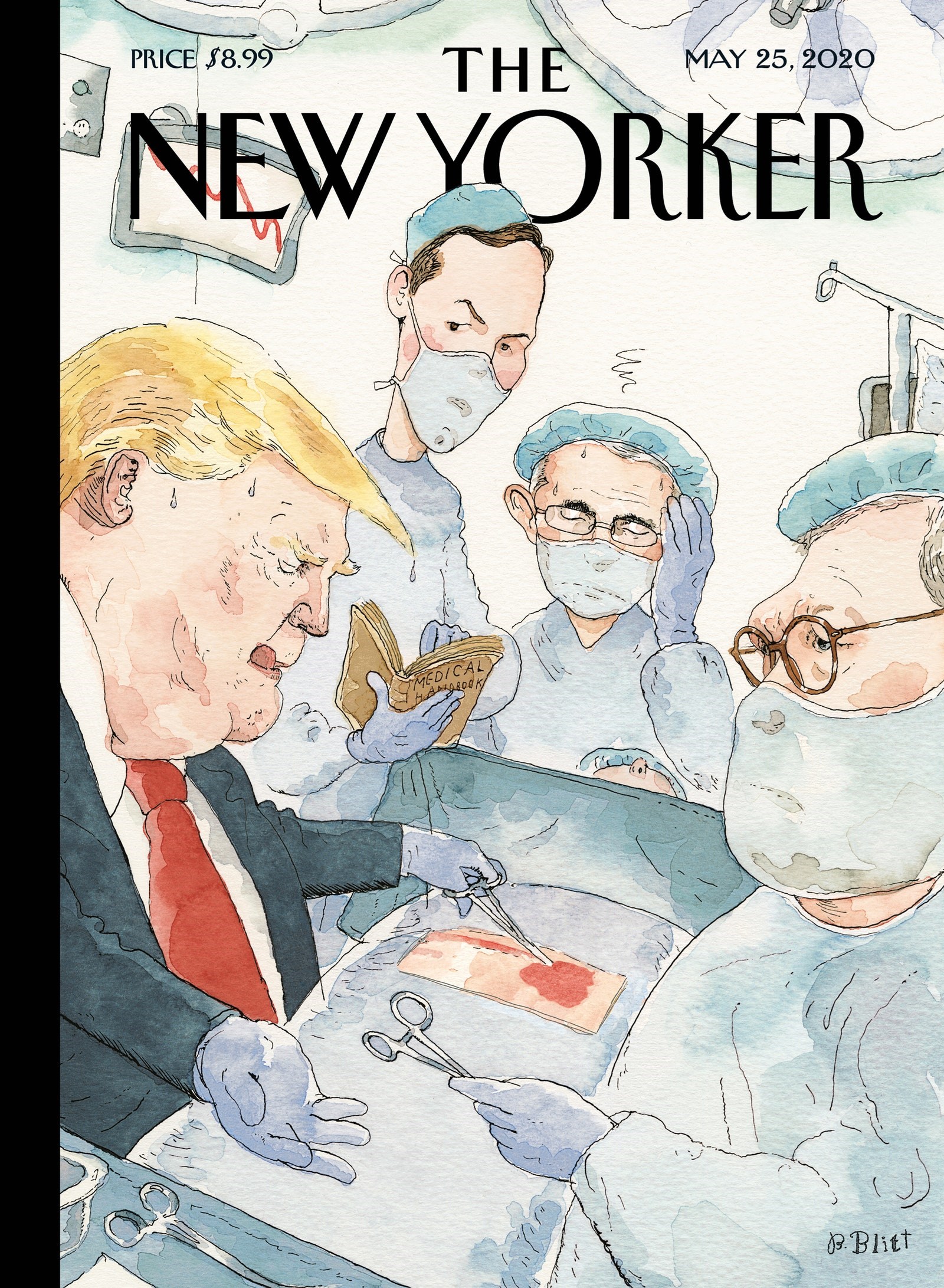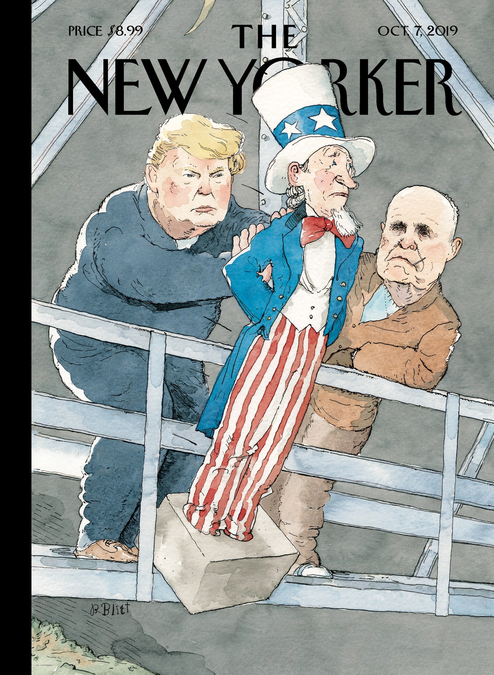 Στις 25 Ιανουαρίου κυκλοφορεί το New Yorker με εμβληματικό εξώφυλλο που συμβολίζει την αλλαγή σελίδας στις ΗΠΑ με την αποχώρηση Τραμπ και την ανάληψη προεδρίας από τον Μπάντεν. Ο λευκοκέφαλος θαλασσαετός, σύμβολο των ΗΠΑ, έχει γραπώσει στα νύχια του τον Ντόναλντ Τραμπ και τον απομακρύνει.
