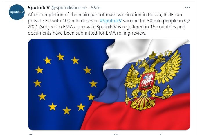 Με ανάρτηση στο Twitter, το Ρωσικό Ταμείο Άμεσων Επενδύσεων (RDIF) γνωστοποίησε ότι είναι σε θέση να εφοδιάσει την Ευρωπαϊκή Ένωση με 100 εκατ. δόσεις του Sputnik-V για 50 εκατ. ανθρώπους στο δεύτερο τρίμηνο του 2021.