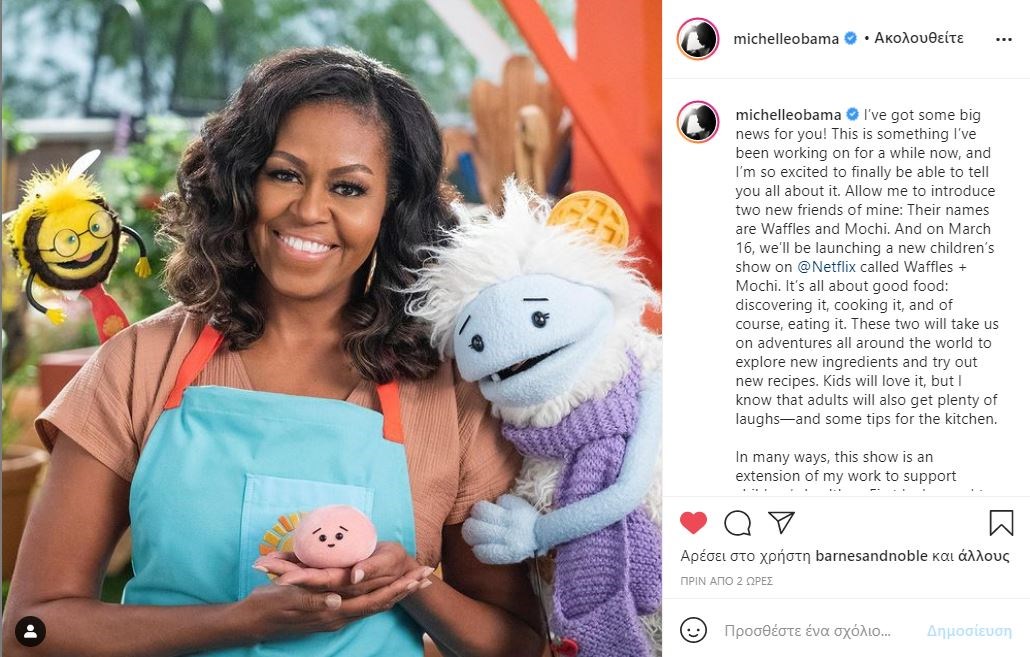 Με μια ανάρτησή της στο instagram η Μισέλ Ομπάμα ανακοίνωσε στους ακολούθους της τα… ευχάριστα νέα της. Όπως σημείωσε η πρώην Πρώτη Κυρία των ΗΠΑ, εργάζεται εδώ και καιρό σ’ αυτό το πρότζεκτ και εμφανίστηκε πολύ χαρούμενη να συστήσει στους ακολούθους της τους δύο φίλους της Waffles και Mochi, με τους οποίους θα παρουσιάζει την παιδική μαγειρική εκπομπή στο Netflix, μία εκπομπή που θα κάνει πρεμιέρα στις 16 Μαρτίου. “Μια εκπομπή που θα αφορά το καλό φαγητό: να το ανακαλύπτουμε, να το μαγειρεύουμε και φυσικά να το τρώμε” επισημαίνει η Μισέλ Ομπάμα. “Αυτοί οι δύο θα μας μεταφέρουν σε περιπέτειες σε ολόκληρο τον πλανήτη για να ανακαλύψουμε νέα συστατικά και να δοκιμάσουμε νέες συνταγές. Τα παιδιά θα τη λατρέψουν, αλλά ξέρω ότι και οι ενήλικες θα το καταδιασκεδάσουν και θα δίνουμε και μερικές συμβουλές για την κουζίνα. Με πολλούς τρόπους αυτή η εκπομπή είναι μία επέκταση της δουλειάς μου για τη στήριξη της υγείας των παιδιών ως Πρώτη Κυρία και για να είμαι ειλικρινής, εύχομαι ένα πρόγραμμα σαν αυτό να υπήρχε όταν οι κόρες μου ήταν μικρές” έγραψε η Μισέλ Ομπάμα ανακοινώνοντας τη νέα αυτή εκπομπή που θα παρουσιάζει,