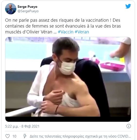 Viral έγινε η φωτογραφία του Γάλλου υπουργού Υγείας, Ολιβιέ Βεράν που τη Δευτέρα έλαβε την πρώτη δόση του εμβολίου. Ο λόγος; Το καλογυμνασμένο κορμί του Γάλλου υπουργού που είναι νευρολόγος στο επάγγελμα.