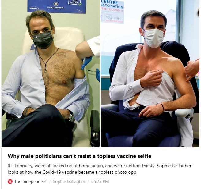 Στη φωτογραφία Βεράν έγινε ειδική αναφορά και στον Independent, με αντιπαραβολή της εικόνας του Πρωθυπουργού, Κυριάκου Μητσοτάκη με το δημοσίευμα να τιτλοφορείται: «Γιατί οι άνδρες πολιτικοί εμβολιάζονται τόπλες και αναρτούν selfie». H αρθρογράφος επισημαίνει ότι αυτή τη νέα μόδα ξεκίνησε πρώτος ο Έλληνας πρωθυπουργός Κυριάκος Μητσοτάκης, ο οποίος εμβολιάστηκε δείχνοντας γυμνό το στήθος του και φορώντας ένα δερμάτινο κολιέ.