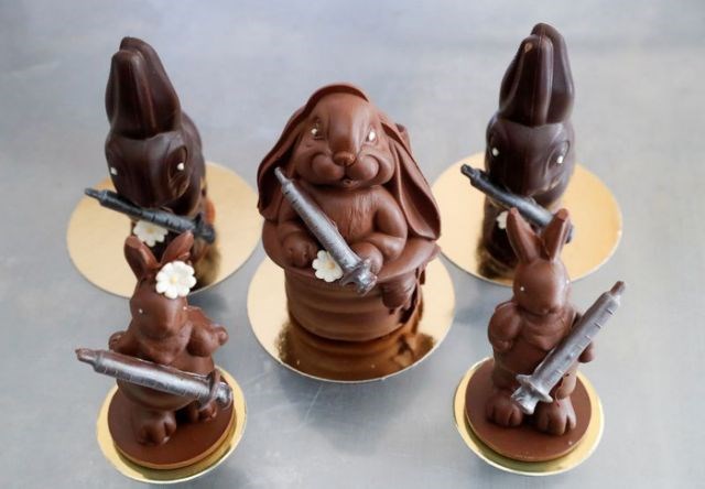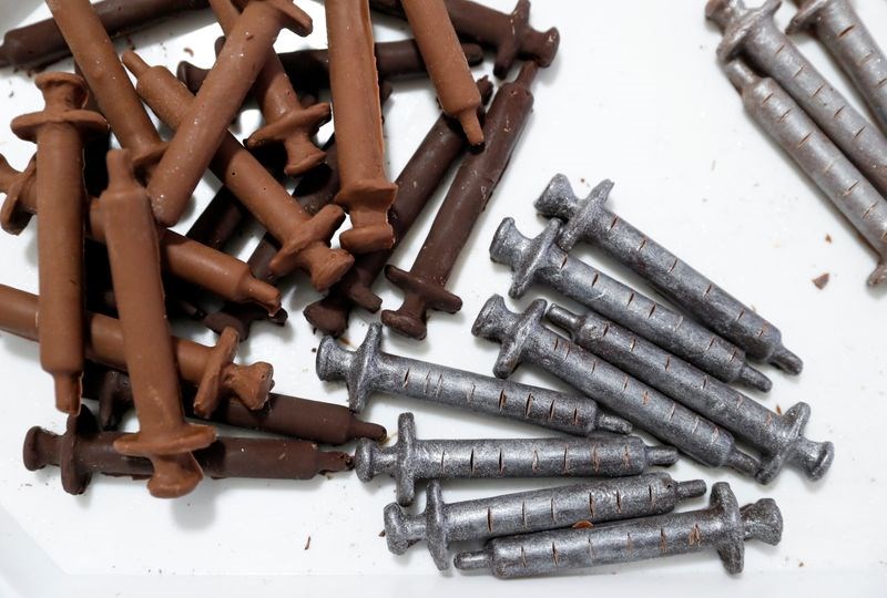 Ο Λάζλο Ριμότσι δημιουργεί σοκολατένια λαγουδάκια που κρατούν σύριγγες εμβολίων και τονίζει ότι τα εμβόλια, που έχουν παρασκευαστεί από καλής ποιότητας ιταλική σοκολάτα και είναι πασπαλισμένα με ασημί χρώμα ζαχαροπλαστικής, δείχνουν ότι υπάρχει διέξοδος από την πανδημία του κορονοϊού.