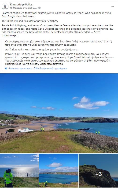Σε νεότερη ανακοίνωση η αστυνομία ενημέρωσε ότι συνέχιζε τις έρευνες στις απόκρημνες περιοχές με την έρευνα να συνδράμουν ναυαγοσωστικά σκάφη και αστυνομικό ελικόπτερο. Αγνοείται από τις 8 Μαρτίου από την περιοχή του Ντέβον, Πλίμουθ.