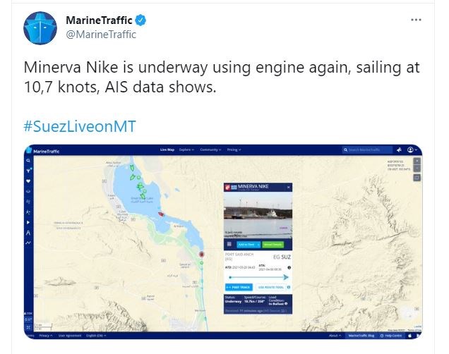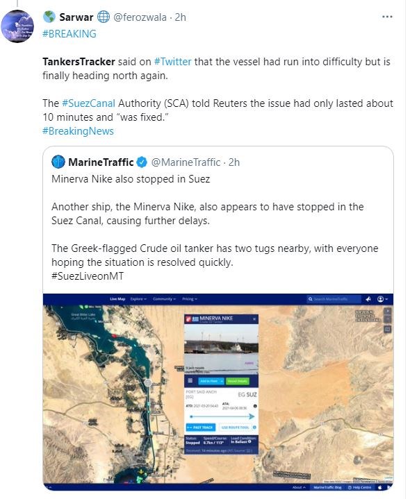 “Δεν επηρεάστηκε η θαλάσσια κίνηση” τόνισε η Αρχή προσθέτοντας ότι 84 πλοία διέσχισαν τη Διώρυγα και από τις δύο κατευθύνσεις την Τρίτη. Το TankersTracker ανέφερε σε ανάρτηση στο twitter ότι το σκάφος αντιμετώπισε δυσκολία αλλά τελικά κινείται βόρεια και πάλι. Ο πρόεδρος της Αρχής της Διώρυγας του Σουέζ δήλωσε στο Reuters πως το πρόβλημα διήρκεσε μόλις 10 λεπτά και επιδιορθώθηκε.