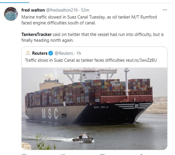 Λίγο νωρίτερα, ένα άλλο τάνκερ, το Rumford, δεξαμενόπλοιο υπό ιταλική σημαία είχε σταματήσει βόρεια του Minerva Nike, αναφέροντας προβλήματα στη μηχανή του. Όπως μετέδωσε το Reuters, οι ιστότοποι MarineTraffic και TankerTrackers σημείωσαν ότι η θαλάσσια κίνηση είχε επιβραδυνθεί καθώς το πετρελαιοφόρο M/T Rumford έμοιαζε να αντιμετωπίζει δυσκολίες στο νότιο τμήμα της Διώρυγας.