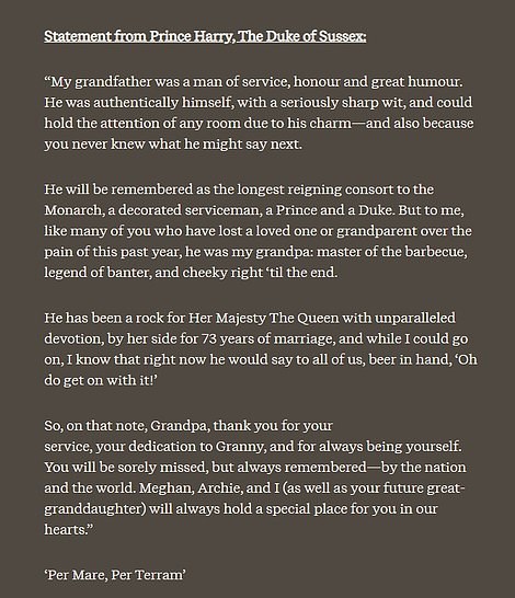 “Ο παππούς μου ήταν ένας άνθρωπος της υπηρεσίας, με τιμή και φοβερό χιούμορ. Ήταν αυθεντικός με οξύ πνεύμα και μπορούσε να κρατήσει την προσοχή σε κάθε δωμάτιο χάρη στη γοητεία του και επειδή ποτέ δεν ήξερες τι μπορούσε να πει μετά. Θα τον θυμόμαστε ως τον μακροβιότερο σύζυγο μονάρχη, ως έναν τιμημένο στρατιωτικό, ως πρίγκιπα και Δούκα. Αλλά για εμένα όπως και για πολλούς από εσάς που χάσαμε έναν αγαπημένο ή παππού μέσα στον πόνο του περασμένου χρόνου, ήταν ο παππούς μου: ο αφέντης του μπάρμπεκιου. ο θρύλος της φάρσας και πονηρούλης μέχρι το τέλος. Έχει υπάρξει ο βράχος για την Αυτής Μεγαλειότητα τη βασίλισσα με απαράμιλλη αφοσίωση για τα 73 χρόνια του γάμου τους, και ενώ θα μπορούσα να συνεχίσω, ξέρω ότι τώρα θα έλεγε σε όλους εμάς με μπίρα στο χέρι “ω άντε τελειώνετε”. Οπότε, σ αυτό το σημείωμα παππού, σ’ ευχαριστώ για την υπηρεσία σου, για την αφοσίωσή σου στη γιαγιά, και επειδή πάντα ήσουν ο εαυτός σου. Θα μας λείψεις πολύ αλλά θα σε θυμόμαστε πάντα -το έθνος και ο κόσμος. Η Μέγκαν, ο Άρτσι κι εγώ (και η μέλλουσα δισεγγονή σου) πάντα θα έχουμε μία ιδιαίτερη θέση στην καρδιά μας για εσένα”. Και ολοκλήρωσε το μήνυμά του με τη λατινική έκφραση “Per mare, per terram”, φράση των πεζοναυτών. (Από θάλασσα, από στεριά)