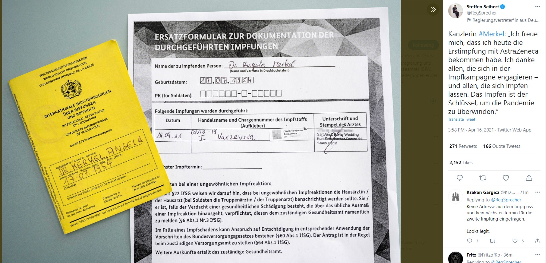 Την πρώτη δόση του εμβολίου της Astrazeneca έλαβε η Άνγκελα Μέρκελ, όπως γνωστοποίησε πριν από λίγο με ανάρτησή του στο Twitter o εκπρόσωπός της, Στέφεν Ζάιμπερτ δημοσιεύοντας, μάλιστα, το πιστοποιητικό. «Είμαι χαρούμενη που έλαβα το πρώτο εμβόλιο της AstraZeneca σήμερα. Θα ήθελα να ευχαριστήσω όλους όσοι συμμετέχουν στην εκστρατεία εμβολιασμού – και σε όλους όσους έχουν εμβολιαστεί. Ο εμβολιασμός είναι το κλειδί για την αντιμετώπιση της πανδημίας», δήλωσε η Μέρκελ, βάσει των όσων ανέφερε ο κ. Ζάιμπερτ. Βάσει του πιστοποιητικού, λοιπόν, η Μέρκελ έλαβε την πρώτη δόση, ωστόσο δεν έχει γνωστοποιηθεί ακόμα το πότε έχει προγραμματιστεί η δεύτερη.