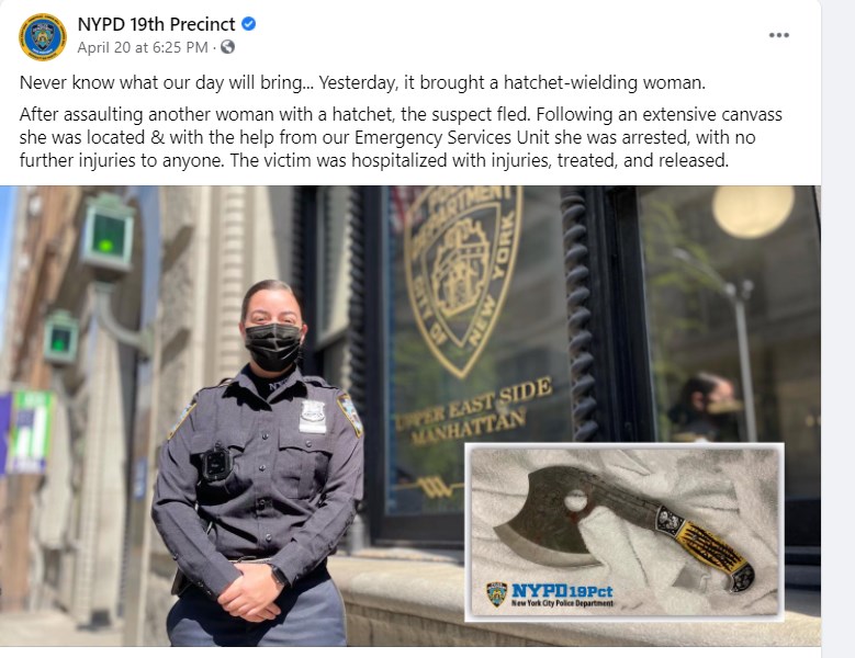 «Ποτέ δεν ξέρεις τι θα σου φέρει η μέρα. Χθες, έφερε μια γυναίκα με τσεκούρι. Αφού τραυμάτισε μια άλλη γυναίκα, η ύποπτη τράπηκε σε φυγή. Μετά από εκτεταμένη έρευνα εντοπίστηκε και με την βοήθεια των αστυνομικών της ειδικής μονάδας του NYPD συνελήφθη, χωρίς περαιτέρω τραυματισμούς», αναφέρει η ανάρτηση.