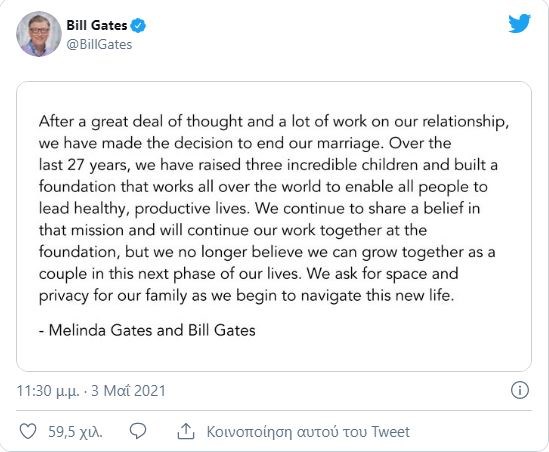 «Μετά από πολλή σκέψη και πολλή δουλειά πάνω στη σχέση μας, έχουμε λάβει την απόφαση να τερματίσουμε τον γάμο μας», ανέφερε στο Twitter ο συνιδρυτής της Microsoft σε ανακοίνωση που συνυπογράφει και η Μελίντα.