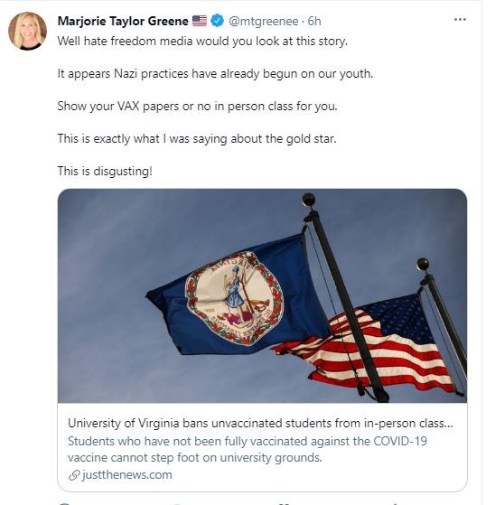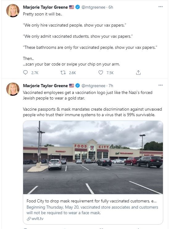 «Οι εμβολιασμένοι εργαζόμενοι λαμβάνουν ένα σήμα εμβολιασμού, όπως οι Ναζί ανάγκαζαν τους Εβραίους να φορούν ένα κίτρινο αστέρι», έγραψε στο Twitter η Γκριν, επικαλούμενη ένα άρθρο που ανέφερε ότι σε ένα σούπερ μάρκετ σήματα θα δείχνουν τους εργαζομένους που έχουν εμβολιαστεί κατά της Covid-19, για τους οποίους η χρήση μάσκας δεν είναι πλέον υποχρεωτική από αυτήν την εβδομάδα.