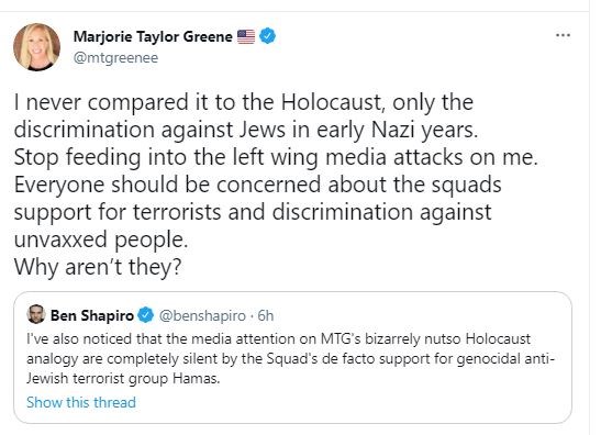 Αντιμέτωπη με την οργισμένη αντίδραση πολλών δημοσιογράφων σήμερα, συμπεριλαμβανομένης μιας επιζήσασας του Ολοκαυτώματος, η Μάρτζορι Τέιλορ- Γκριν είπε με νέο tweet της: «Δεν το συνέκρινα ποτέ με το Ολοκαύτωμα, απλά με τη διάκριση εναντίον των Εβραίων κατά τα πρώτα χρόνια των Ναζί. Σταματήστε να διαστρεβλώνετε τα λεγόμενά μου», επιτέθηκε στον δημοσιογράφο Τζέικ Σέρμαν του ειδησεογραφικού ιστοτόπου Punchbowl News, ο οποίος έγραψε: «Δεν θέλω να επαναλάβω αυτές τις ανοησίες, αλλά ως Εβραίος, αισθάνομαι ότι πρέπει να επισημάνω πόσο αηδιαστικές είναι. Οι Ναζί δολοφόνησαν έξι εκατομμύρια Εβραίους».