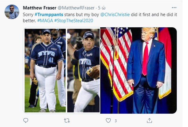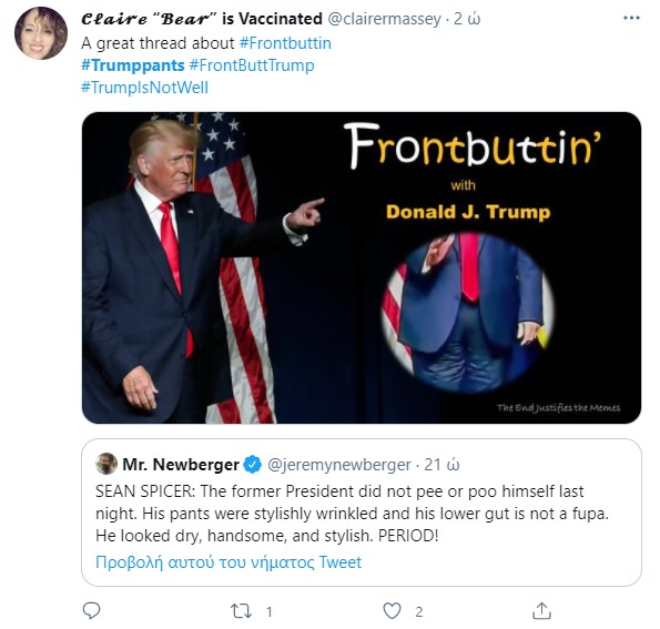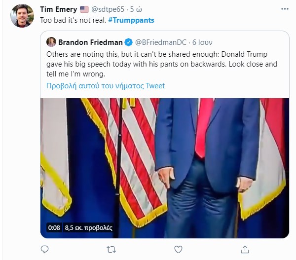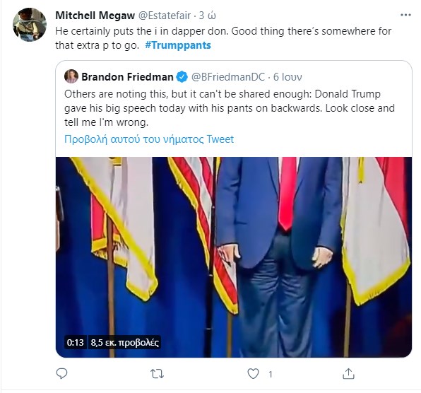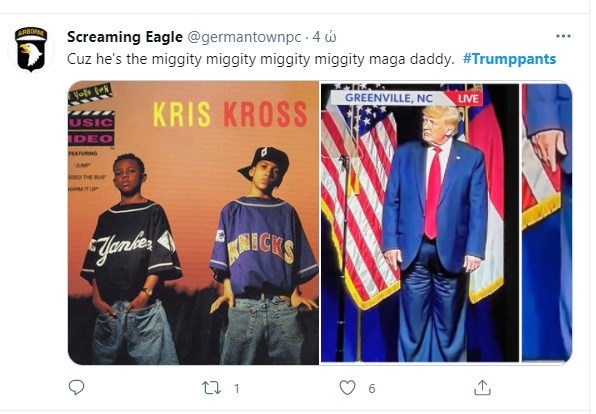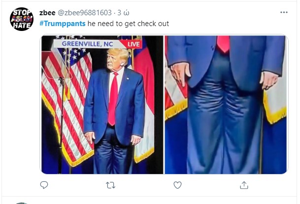 Διχασμένο είναι το Twitter για το λεγόμενο #Trumppants. Η συζήτηση ξεκίνησε κατά τη διάρκεια της ομιλίας του πρώην προέδρου των ΗΠΑ, Ντόναλντ Τραμπ. Κάποιοι χρήστες υποστηρίζουν ότι ο Τραμπ φορούσε ανάποδα το παντελόνι στην εκδήλωση στη Βόρεια Καρολίνα, καθώς παρατήρησαν κάτι περίεργο όταν αποχώρησε από το βάθρο.