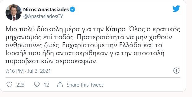 Με ανάρτησή του στο twitter ο πρόεδρος της Κυπριακής Δημοκρατίας Νίκος Αναστασιάδης σχολιάζει το πύρινο μέτωπο που μαίνεται σε ορεινές περιοχές των Επαρχιών Λεμεσού και Λάρνακας.