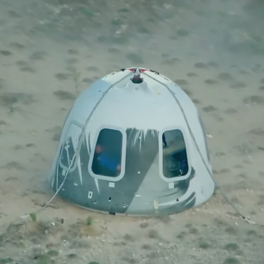 Η κάψουλα που μετέφερε τον Μπέζος και άλλους τρεις συνταξιδιώτες του προσγειώθηκε στην έρημο του Τέξας, έπειτα από μια πτήση διάρκειας σχεδόν 11 λεπτών, όπου ξεπέρασε το ύψος των 100 χιλιομέτρων, πέραν της γραμμής Κάρμαν, του διεθνώς αναγνωρισμένου ορίου μεταξύ της γήινης ατμόσφαιρας και του διαστήματος. Οι επιβάτες πέρασαν τέσσερα λεπτά σε μηδενική βαρύτητα πριν επιστρέψουν στη Γη.