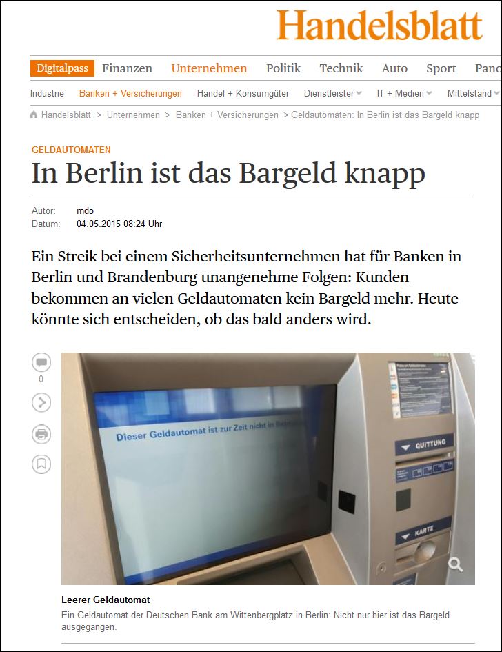 Σύμφωνα με τα όσα αναφέρει η εφημερίδα Handelsblatt, «Σάββατο βράδυ στο υποκατάστημα της Commerzbank στην Alexanderplatz: μια “αρμάδα” ΑΤΜ διαθέσιμη αλλά ούτε ένα από τα δέκα μηχανήματα δεν έχει χρήματα. Η ίδια εικόνα την Κυριακή σε υποκατάστημα της Deutsche Bank: Έξι τα αυτόματα μηχανήματα, μηδέν τα χαρτονομίσματα. Η πρωτεύουσα ξεμένει από χρήματα».