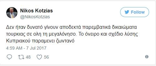 Ο κ. Κοτζιάς με μήνυμά του στο twitter τα ξημερώματα ανέφερε ότι «δεν ήταν δυνατό να γίνουν αποδεκτά παρεμβατικά δικαιώματα Τουρκίας σε όλη τη Μεγαλόνησο. Το όνειρο και σχέδιο λύσης του Κυπριακού παραμένει ανοικτό».