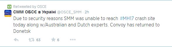 Ο Οργανισμός για την Ασφάλεια και τη Συνεργασίας στην Ευρώπη (ΟΑΣΕ) ανακοίνωσε στο Twitter ότι τα μέλη του που ταξίδευαν μαζί με Αυστραλούς και Ολλανδούς ειδικούς αναγκάστηκαν να επιστρέψουν στην πρωτεύουσα της επαρχίας Ντονέτσκ για «λόγους ασφαλείας».