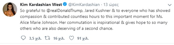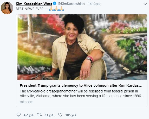 Ο Αμερικανός πρόεδρος Ντόναλντ Τραμπ έδωσε χάρη στην 63χρονη γυναίκα την αποφυλάκιση της οποίας είχε ζητήσει η Κιμ Καρντάσιαν, η οποία μάλιστα είχε επισκεφθεί την προηγούμενη εβδομάδα τον Λευκό Οίκο για τον σκοπό αυτό.