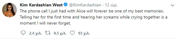 «Είναι τα καλύτερα νέα. Η τηλεφωνική επικοινωνία που είχα μόλις με την Άλις θα είναι για πάντα μία από τις καλύτερες αναμνήσεις. Το να της το ανακοινώσω και να ακούσω τις φωνές της, ενώ κλαίγαμε μαζί είναι μια στιγμή που δεν θα ξεχάσω», έγραψε η σταρ στον λογαριασμό της στο Twitter.