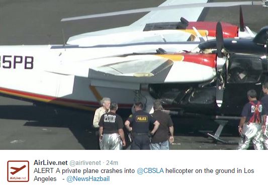 Ένα ιδιωτικό αεροπλάνο συγκρούστηκε στο έδαφος με ελικόπτερο του τηλεοπτικού δικτύου CBS . Το περιστατικό έγινε στο Λος Άντζελες και μέχρι στιγμής δεν υπάρχουν περισσότερες πληροφορίες.