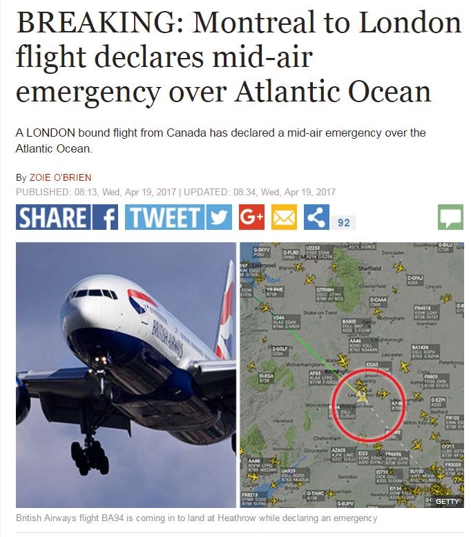 Σήμα κινδύνου εξέπεμψε αεροσκάφος που βρίσκεται εν πτήσει, εκτελώντας το δρομολόγιο από το Μόντρεαλ προς το Λονδίνο.Το αεροσκάφος της British Airways εξέπεμψε σήμα κινδύνου πάνω από τον Ατλαντικό Ωκεανό. Σύμφωνα με τα διεθνή ΜΜΕ, το αεροσκάφος πετούσε στα 41.000 πόδια όταν εξέπεμψε το σήμα κινδύνου και κατευθύνεται στο αεροδρόμιο του Χίθροου.