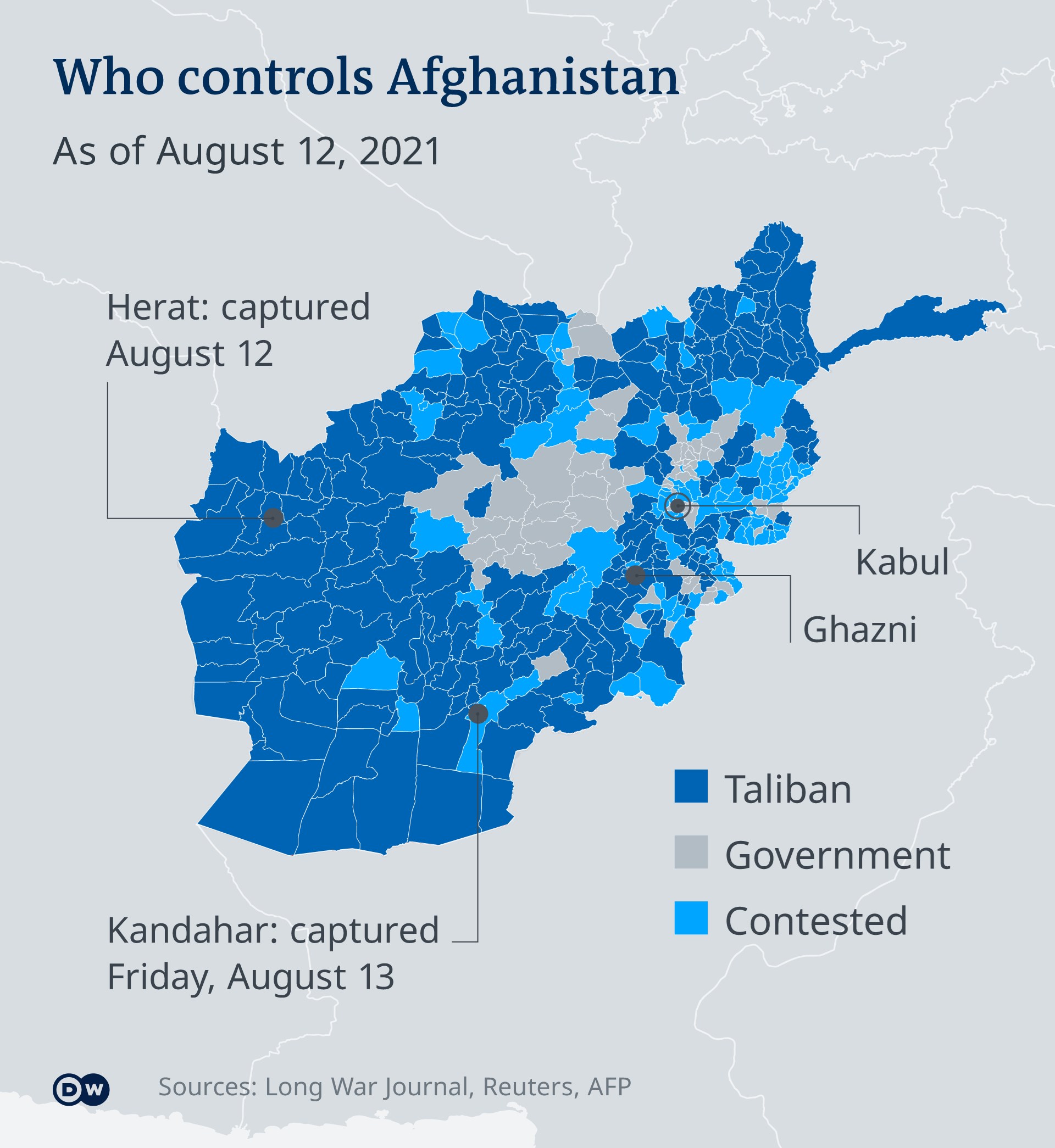Ουσιαστικά, μέσα σε αυτό το χορνικό διάστημα, οι Ταλιμπάν έχουν κυριεύσει περίπου τις μισές από τις πρωτεύουσες των επαρχιών του Αφγανιστάν. Ελέγχουν το μεγαλύτερο μέρος του βόρειου, του δυτικού και του νότιου τμήματος της χώρας. Η Καμπούλ, η Μαζάρ-ι-Σαρίφ, η μεγαλούπολη του βορρά, καθώς και η Τζαλαλάμπαντ (ανατολικά) είναι οι μοναδικές τρεις μεγάλες πόλεις που βρίσκονται ακόμα υπό τον έλεγχο των κυβερνητικών δυνάμεων.