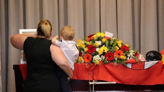 Ο Χάρβεϊ Κίτον, μόλις 19 μηνών, φορώντας στολή πυροσβέστη και έχοντας την πιπίλα του στο στόμα δέχθηκε το παράσημο του πατέρα του που τιμήθηκε μετά θάνατον. Δεκάδες πυροσβέστες σχημάτισαν φρουρά απόδοσης τιμής στο φέρετρο του νεκρού συναδέλφου τους.