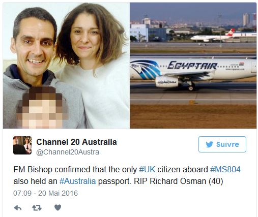 Την είδηση ότι ένας Αυστραλός, με βρετανική υπηκοότητα, είναι ανάμεσα στους επιβάτες της πτήσης MS804 της Egyptair, επιβεβαίωσε η υπουργός Εξωτερικών της Αυστραλίας, Τζούλι Μπίσοπ.