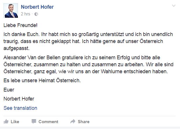 «Συγχαίρω τον Αλεξάντερ Βαν Ντερ Μπέλεν για την επιτυχία και καλώ όλους τους Αυστριακούς να παραμείνουν αλληλέγγυοι και να εργαστούν από κοινού», τόνισε ο Χόφερ, που είναι και αντιπρόεδρος του κοινοβουλίου, δηλώνοντας ταυτόχρονα «βαθιά λυπημένος» για την ήττα του.