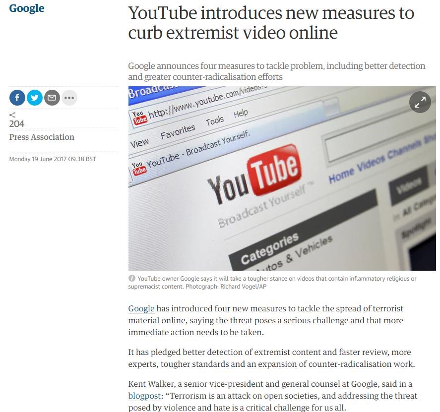 «Η Google και το YouTube δεσμεύονται να συμμετάσχουν στη λύση», πρόσθεσε ο ίδιος. «Συνεργαζόμαστε με τις κυβερνήσεις, τις αρχές επιβολής του νόμου και οργανώσεις της κοινωνίας των πολιτών για την αντιμετώπιση του προβλήματος του διαδικτυακού βίαιου εξτρεμισμού. Δεν υπάρχει χώρος στις υπηρεσίες μας για περιεχόμενο που αναρτούν οι τρομοκράτες».