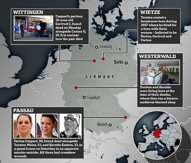 Στη δημοσιότητα έρχονται φωτογραφίες των θυμάτων αλλά και των χώρων όπου βρέθηκαν τα θύματα. Η τελευταία που έμεινε ζωντανή, ήταν η Φαρίνα Κασπάρι, 30 ετών, η οποία φέρεται να έστρεψε εναντίον της τη βαλλίστρα και το βέλος να διαπέρασε τον λαιμό της. Περίεργη είναι η εμπλοκή του επίσης νεκρού Τόρστεν Βάις, 53 ετών, ο οποίος περιγράφεται ως ένας αυταρχικός άνθρωπος που φερόταν στις γυναίκες λες και ήταν σκλάβες του. Ήταν ιδιοκτήτης καταστήματος μεσαιωνικών αντικειμένων στο Χάχενμπουργκ της Ρηνανίας-Παλατινάτου, με το όνομα “Milites Conductius”, όπου διετίθεντο μεσαιωνικά ξιφίδια και σπαθιά. Είχε μακριά άσπρη γενειάδα και οργάνωνε βραδιές με ξιφομαχίες. Στο μπράτσο του είχε τατουάζ με σύμβολα των Αλχημιστών, του αποκρυφιστικού κινήματος που άνθησε στον Μεσαίωνα και υποστήριζε ότι κατέχει το μυστικό της μετατροπής των μετάλλων σε χρυσό.