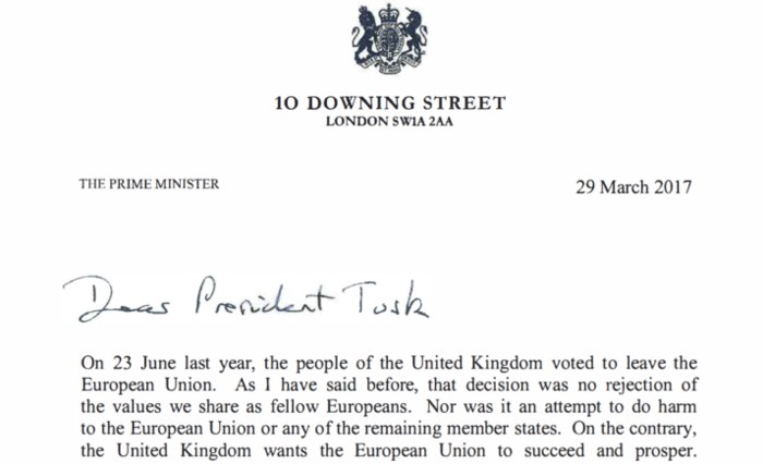 Η Βρετανίδα πρωθυπουργός Τερέζα Μέι υπέγραψε αργά χθες το βράδυ την επιστολή που υποβλήθηκε σήμερα στις Βρυξέλλες με την οποία ξεκίνησε η διαδικασία για την αποχώρηση της Βρετανίας από την Ευρωπαϊκή Ένωση.Στην επιστολή της προς τον πρόεδρο του Ευρωπαϊκού Συμβουλίου Ντόναλντ Τουσκ, σε μια ένδειξη ότι προτίθεται να δείξει καλή θέληση στις διαπραγματεύσεις, ανέφερε ότι γνωρίζει πως θα υπάρξουν συνέπειες από την αποχώρηση και ότι η Βρετανία θα απολέσει την επιρροή της όσον αφορά τους κανονισμούς που διέπουν την ευρωπαϊκή οικονομία.”Κατανοούμε και σεβόμαστε τη θέση σας ότι οι τέσσερις ελευθερίες της ενιαίας αγοράς είναι αδιαίρετες και δεν μπορεί να υπάρξει επιλεκτική εφαρμογή”, ανέφερε. “Γνωρίζουμε επίσης ότι οι βρετανικές εταιρείες, στις συναλλαγές τους με την ΕΕ, θα πρέπει να συμμορφώνονται με τους κανόνες που έχουν συμφωνηθεί από τους θεσμούς στους οποίους δεν θα μετέχουμε πλέον, όπως κάνουν και σε άλλες αγορές”, υπογράμμισε.Αναφερόμενη στο θέμα της θέσης των Ευρωπαίων πολιτών στη Βρετανία και των Βρετανών που ζουν και εργάζονται σε χώρες της ΕΕ, η Μέι εξέφρασε την ελπίδα να υπάρξει μια συμφωνία όσο το δυνατόν συντομότερα.”Πιστεύω ότι υπάρχει καλή θέληση και από τις δύο πλευρές” για να επιτευχθεί μια τέτοια συμφωνία, είπε στην ομιλία της στο βρετανικό κοινοβούλιο.Δείτε την επιστολή: