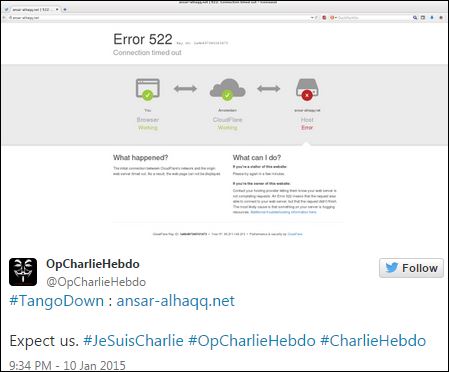 Σύμφωνα με την εφημερίδα Independent, οι Anonymous εμφανίστηκαν στο Twitter με τον λογαριασμό @OpChalieHebdo. Βάζοντας μπροστά το hashtag #TangoDown, ανακοίνωσαν την πρώτη επίθεση στη γαλλική ιστοσελίδα ansar-alhaqq.net.