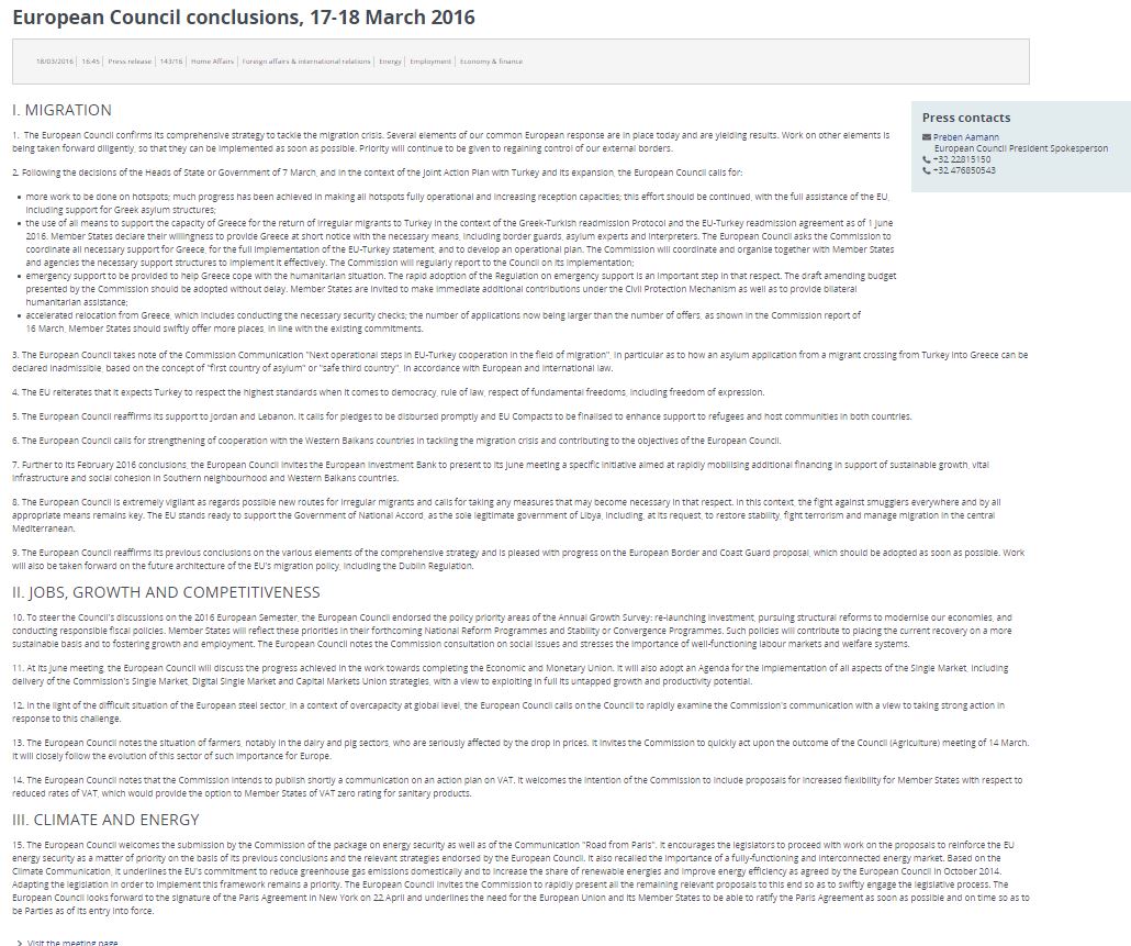 «Το Ευρωπαϊκό Συμβούλιο επιβεβαίωσε την συνολική στρατηγική για την αντιμετώπιση της προσφυγικής κρίσης. Πολλά στοιχεία της κοινής μας ευρωπαϊκής πολιτικής αναφέρθηκαν σήμερα και απέδωσαν αποτελέσματα.