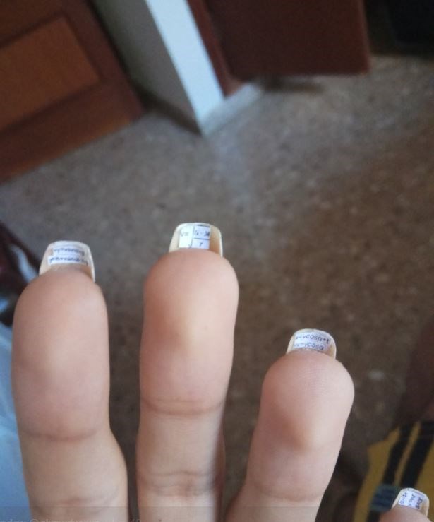 Όπως φαίνεται στις φωτογραφίες που ανέβασε στον λογαριασμό της στο twitter, η μαθήτρια έγραψε τους τύπους της Φυσικής από την μέσα πλευρά των νυχιών της, τα οποία ήταν βαμμένα και μακριά.