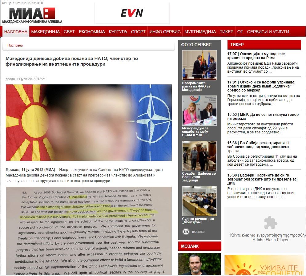 Το προσχέδιο των συμπερασμάτων της Συνόδου του ΝΑΤΟ, το οποίο θα απευθύνει πρόσκληση στην ΠΓΔΜ για την έναρξη των ενταξιακών της διαπραγματεύσεων στη Συμμαχία, έφερε στο φως της δημοσιότητας το κρατικό πρακτορείο ειδήσεων της γείτονος, το «Mia».Όπως αναφέρεται στο προσχέδιο «στη Σύνοδο Κορυφής του Βουκουρεστίου το 2008, είχαμε αποφασίσει ότι το ΝΑΤΟ θα απευθύνει πρόσκληση στην πΓΔΜ για ένταξη στη Συμμαχία μόλις επιτευχθεί αμοιβαία αποδεκτή λύση στο ζήτημα της ονομασίας στα πλαίσια του ΟΗΕ. Χαιρετίζουμε την ιστορική συμφωνία μεταξύ Αθήνας και Σκοπίων σχετικά με την επίλυση του ονοματολογικού ζητήματος. Συμφώνως με την πολιτική μας, αποφασίσαμε να καλέσουμε την κυβέρνηση των Σκοπίων προκειμένου να ξεκινήσει ενταξιακές συνομιλίες για να ενταχθεί στη Συμμαχία μας. Η πλήρης εφαρμογή των προβλεπόμενων εσωτερικών διαδικασιών σε σχέση με τη συμφωνία για τη λύση του ονοματολογικού αποτελεί προϋπόθεση για την επιτυχή ολοκλήρωση της διαδικασίας προσχώρησης».