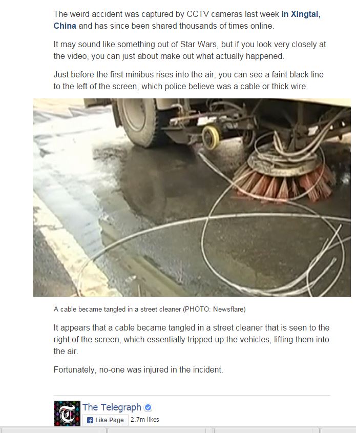 Σύμφωνα πάντως με την βρετανική εφημερίδα Telegraph, το… «φάντασμα», όπως πολλοί έλεγαν, που τελικά ευθύνεται για το περιστατικό που συνέβη σε δρόμο της Κίνας, δεν είναι άλλο από ένα καλώδιο.