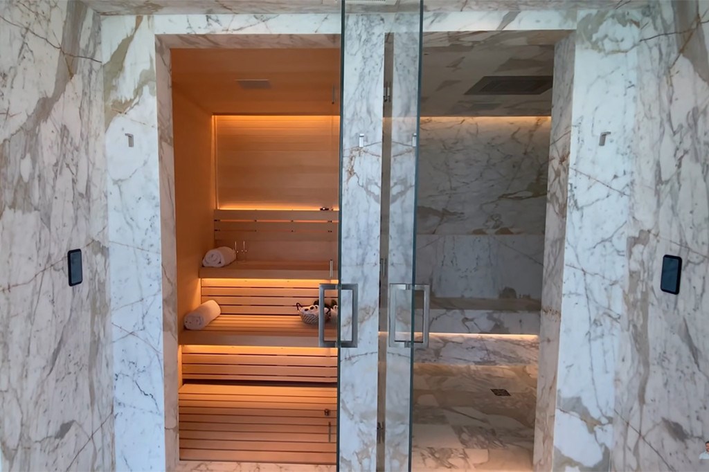 Από μπροστά προς τα πίσω, το μπάνιο είναι “ντυμένο” με ιταλικό μάρμαρο. διαθέτει μπαρ, τουαλέτα και μπιντέ, μπανιέρα με υδρομασάζ, δωμάτιο-ντουλάπα και καμπίνα ντους ψιλής βροχής με θέα στον ωκεανό και την πόλη. Τα φωτισμένα, ράφια από μάρμαρο που βρίσκονται απέναντι από τον νιπτήρα.