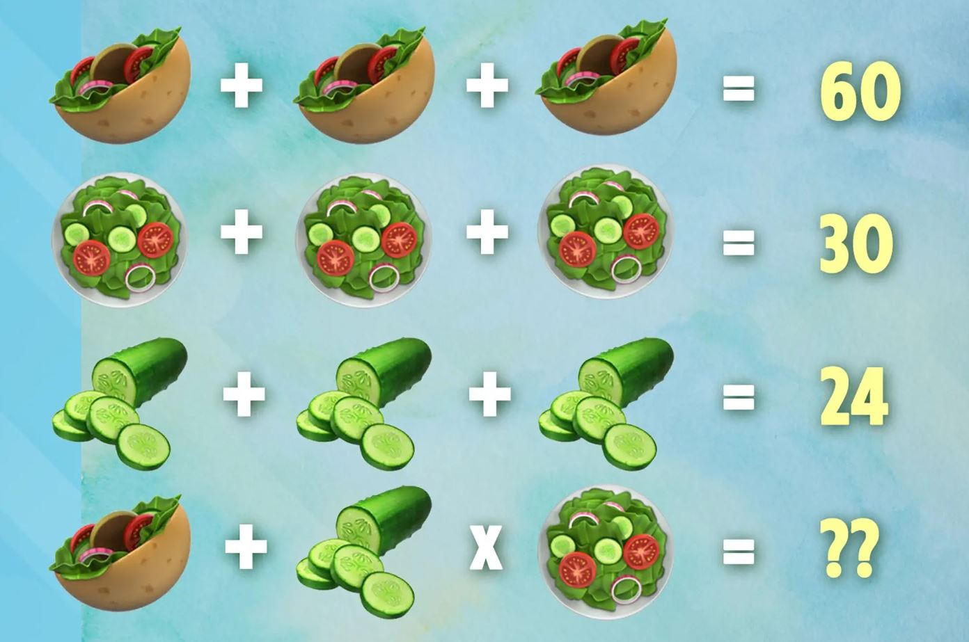 Η απάντηση στο μαθηματικό πρόβλημα είναι 100. Πρέπει πρώτα να πολλαπλασιάσουμε την αξία του αγγουριού (8) και της σαλάτας (10) – που φτάνει στο 80 – και στη συνέχεια να προσθέσουμε την αξία του τάκο (20) σε αυτό.