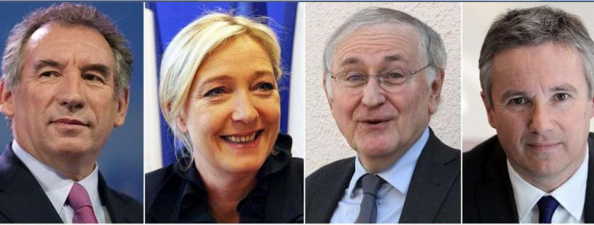 Από τα αριστερά προς τα δεξιά:-Francois Bayrou: Ο 60χρονος πρώην υπουργός της Γαλλίας, είναι υποψήφιος για την προεδρεία της Γαλλίας για τρίτη φορά. Είναι επικεφαλής του κόμματος Mouvement démocratique (Κίνηση Δημοκρατίας) και στις δημοσκοπήσεις συγκεντρώνει ποσοστό 12%. -Marine Le Pen: Η 43χρονη, είναι κόρη του Γάλλου ακροδεξιού πολιτικού Jean-Marie Le Pen. Είναι αρχηγός του ακροδεξιού κόμματος της Γαλλίας, ενώ αξιώνει την έξοδο της Γαλλίας από το ευρώ. Στις δημοσκοπήσεις συγκεντρώνει 13,5%. -Jacques Cheminade: Ο 70χρονος υποψήφιος, επικεφαλής του κόμματος Solidarité et Progrès (Αλληλεγγύη και πρόοδος) συγκεντρώνει 0% στις δημοσκοπήσεις και πολλοί αναρωτιούνται ακόμα και για το πώς κατάφερε να στγκεντρώσει 500 υπογραφές για να ιδρύσει το κόμμα του. Μια από τις κύριες θέσεις του είναι να καταστρέψει τον οικονομικό φασισμό της Wall Street. -Nicolas Dupont-Aignan: Ο 51χρονος υποψήφιος συγκεντρώνει στις δημοσκοπήσεις ποσοστό 0,5% και τάσσεται κάπου μεταξύ κέντρου και σοσιαλιστών.