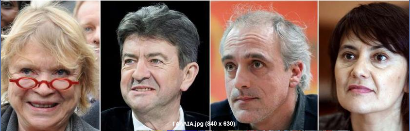 Από αριστερά προς τα δεξιά:-Eva Joly: Η 68χρονη υποψήφια έγινε γνωστή, ως η γυναίκα που αποκάλυψε μεγάλο σκάνδαλο πετρελαϊκής εταιρείας και είναι επικεφαλής των Πράσινων της Γαλλίας. Στις δημοσκοπήσεις συγκεντρώνει 2%. -Jean-Luc Mélenchon: Ο 60χρονος υποψήφιος, επικεφαλής των Αριστερών, έχει τη στήριξη του Oskar Lafontaine, ενώ το 2008 αποχώρησε από το κόμμα των Σοσιαλιστών. Συγκεντρώνει 15% στις δημοσκοπήσεις. -Philippe Poutou: 0 45χρονος είναι επικεφαλής του κόμματος των Τροτσκιστών και συγκεντρώνει 0,5% στις δημοσκοπήσεις. -Nathalie Arthaud: Η 42χρονη επίσης Τροτσκίστρια ηγείται της παράταξης “Lutte Ouvrière” και συγκεντρώνει ποσοστό 0,5% στις δημοσκοπήσεις.