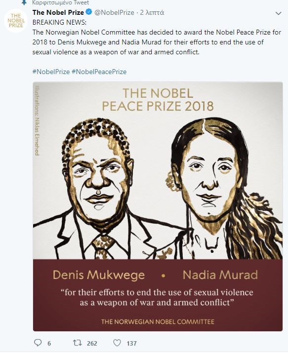 Ο γυναικολόγος Ντένις Μουκουέγκε από το Κονγκό και η Γιαζίντι Νάντια Μουράντ βραβεύονται με το Νόμπελ Ειρήνης 2018, για το έργο τους κατά της σεξουαλικής βίας ως εργαλείο πολέμου και σε πολεμικές συγκρούσεις.