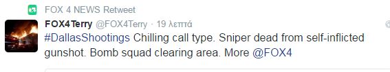 Συγκεκριμένα, όπως αναφέρει αμερικανικό δίκτυο ενημέρωσης, ο ένας από τους δράστες του μακελειού στο Ντάλας, με τον οποίο διαπραγματεύονταν οι αστυνομικοί, έβαλε τέλος στη ζωή του.