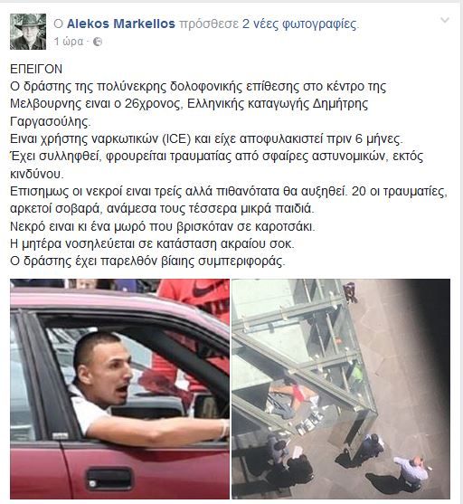 Ο 26χρονος, ελληνικής καταγωγής, Δημήτρης Γαργασούλης είναι ο δράστης της επίθεσης στο κέντρο της Μελβούρνης, με τρεις νεκρούς και 20 τραυματίες.