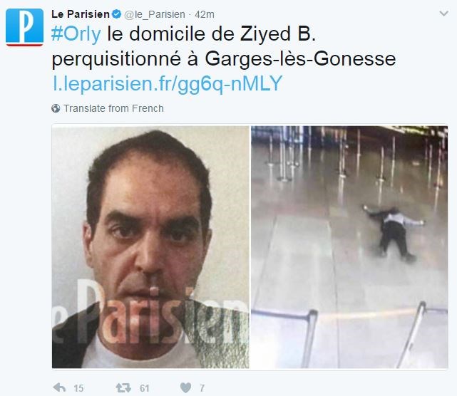Η Γαλλική εφημερίδα Le Parisien έδωσε στη δημοσιότητα το πρόσωπο του δράστη που επιτέθηκε νωρίτερα στο αεροδρόμιο του Ορλί στο Παρίσι.Ο λόγος για τον 39χρονο, Ζιγέντ Μπεν Μπελγκασέμ, ο οποίος προσπάθησε να αποσπάσει το όπλο ενός στρατιώτη και λίγα λεπτά αργότερα έπεσε νεκρός από πυρά στρατιωτικών. Μιάμιση ώρα πριν από την επίθεση στο Ορλί, ο άνδρας είχε πυροβολήσει εναντίον των αστυνομικών που τον σταμάτησαν για έλεγχο σε ένα βόρειο παρισινό προάστιο και στη συνέχεια έκλεψε ένα αυτοκίνητο σε ένα νότιο προάστιο προκειμένου να μεταβεί στο αεροδρόμιο, σε απόσταση 10 χλμ. από εκεί.Σχεδόν 3.000 άνθρωποι απομακρύνθηκαν από τον νότιο τερματικό σταθμό και οι επιβάτες που βρίσκονταν στον δυτικό τερματικό σταθμό περιορίστηκαν εκεί, διευκρίνισε ο εκπρόσωπος του υπουργείου Εσωτερικών Πιέρ-Ανρί Μπραντέ. Δεν υπήρξαν τραυματίες, πρόσθεσε.Από την έρευνα διαπιστώθηκε ότι δεν υπήρχαν εκρηκτικά, ανακοίνωσε το υπουργείο Εσωτερικών.Λίγη ώρα από το περιστατικό, στο Twitter κυκλοφόρησε φωτό-ντοκουμένο, που δείχνει τον δράστη, πεσμένο νεκρό στο πάτωμα, χωρίς οι Αρχές ακόμα να έχουν προσδιορίσει την ταυτότητά του, τονίζοντας, ωστόσο, ότι σύμφωνα με τις πρώτες ενδείξεις πρόκειται για ”ριζοσπαστικοιημένο μουσουλμάνο”.